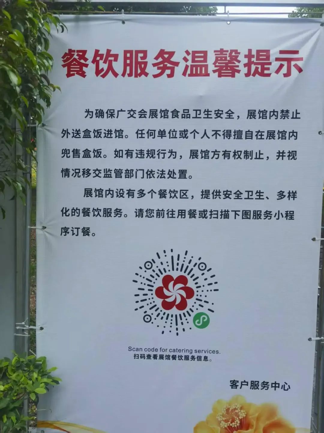在广交会展馆入口显著位置张贴有“餐饮服务温馨提示”:为确保广交会展馆食品卫生安全,展馆内禁止外送盒饭进馆。任何单位或个人不得擅自在展馆内兜售盒饭。展馆内设有多个餐饮区,提供安全卫生、多样化的餐饮服务。食客可前往用餐或通过扫描“广交会展馆服务”微信小程序订餐。
