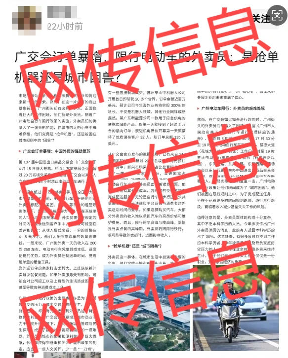 4月21日,有自媒体账号在某资讯平台发布题为“广交会订单暴增,限行电动车的外卖员:是抢单机器还是城市困兽?”的网帖,称广交会传来令人振奋的消息,订单量呈现出爆发式增长,部分产品订单甚至暴增300%,“然而,在这一片向好的商业景象背后,广州街头却有这样一群人,正面临着巨大的工作困境,他们就是外卖员。”